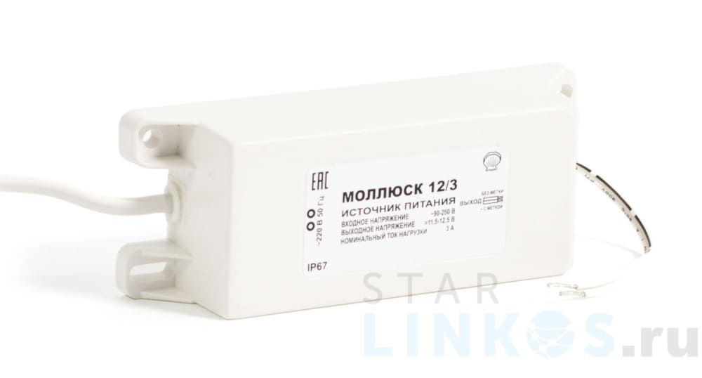 Блок питания «Бастион «Моллюск» 12/3 адаптирован к работе на улице в любое время года: корпус соответствует стандарту защиты от пыли и влаги IP67, рабочие температуры — –30 ºС… +40 ºС. Рассчитан на подключение устройства, потребляющего постоянный ток с номинальным напряжением 12 В. Характеристики: Напряжение электросети — 90 В ~ 250 В. Выходное напряжение в интервале 11.5 В ~ 12.5 В. Максимальный ток нагрузки — 3 А. Электрическая прочность изоляции — 3 кВ. Электронная защита от перегрузки, короткого замыкания. Энергопотребление без нагрузки — 5 ВА. «Моллюск» 12/3 укомплектован светодиодным индикатором питания. Для удобства фиксации предусмотрены проушины и отверстия под крепеж. Размер — 49×133×33 мм. Вес — 280 г.