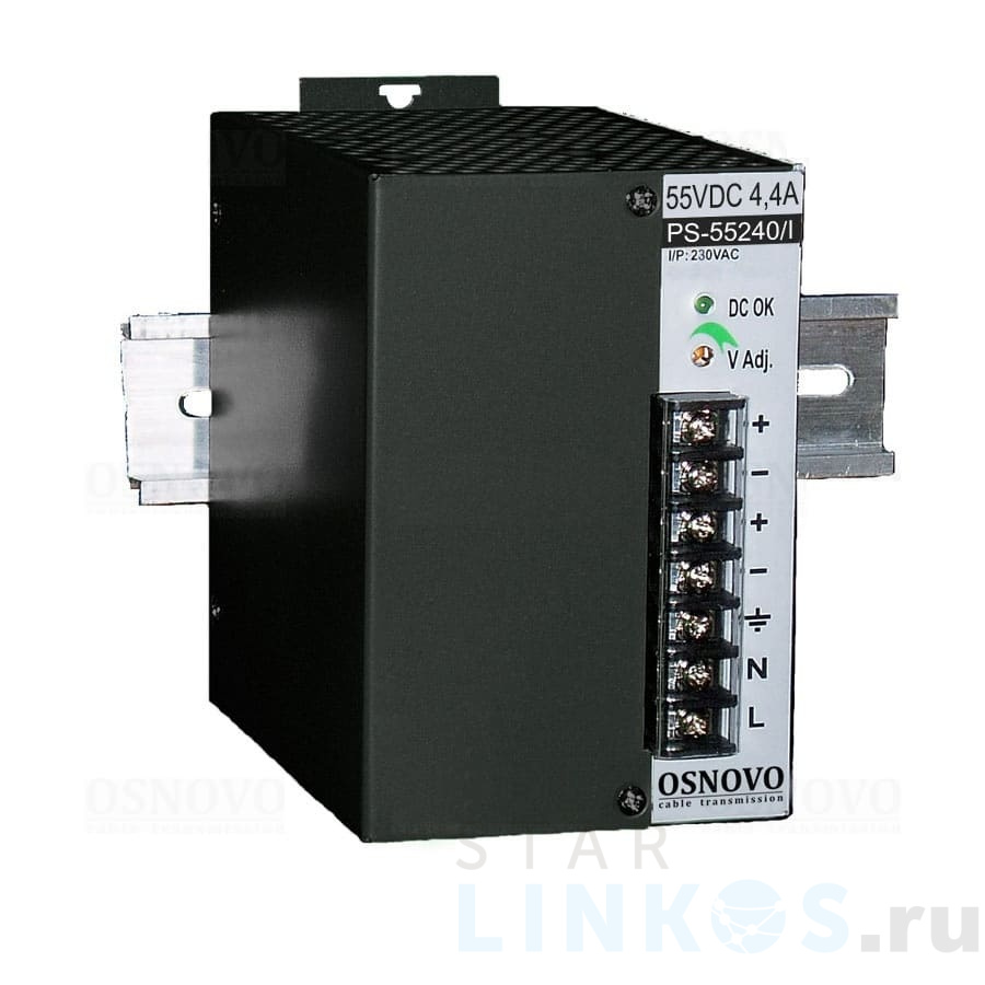 Блок питания Osnovo PS-55240/I промышленного класса поддерживает защиту от короткого замыкания, перенапряжения и перегрузки, автоматическое восстановление работоспособности после перепадов сетевого напряжения и КЗ. Характеристики: Диапазон входного напряжения — AC 195 ~ 265 В. Стабилизация напряжения. Номинальное напряжение на выходе — DC 55 В. Регулирование выходного напряжения — 50 ~ 60 В. Выходная мощность — до 240 Вт. Ток на выходе — 4.4 А. PS-55240/I оборудован клеммами подключения нейтрального (вход) и фазового (вход) провода, выхода питания, заземления, двумя дополнительными клеммами выхода питания, вентилятором системы охлаждения, LED-индикатором состояния. Подключение — под винт. Рабочие температуры — –40 °C… +50 °C. Монтаж — на DIN-рейку, стену. Размер — 75×110×121 мм.