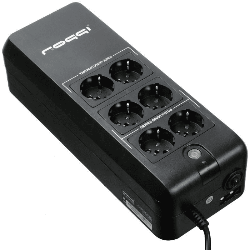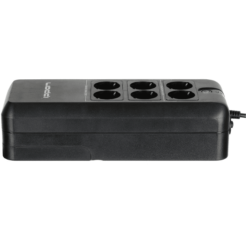 Резервный ИБП на 6 устройств, Off-Line, 9 мин. батарейной поддержки, разъем входа Euro, разъемы выхода Euro (4 шт. с батарейной поддержкой, 2 шт. байпасные с фильтрацией), полная мощность 400 ВА, активная — 200 Вт, вход 170–270 В, 50–60 Гц, выход 220 В, батарея 12 В, 4.5 А·ч — необслуживаемая герметичная кислотно-свинцовая, защита и фильтрация, RJ-45, светодиодная индикация, звуковые сигналы.