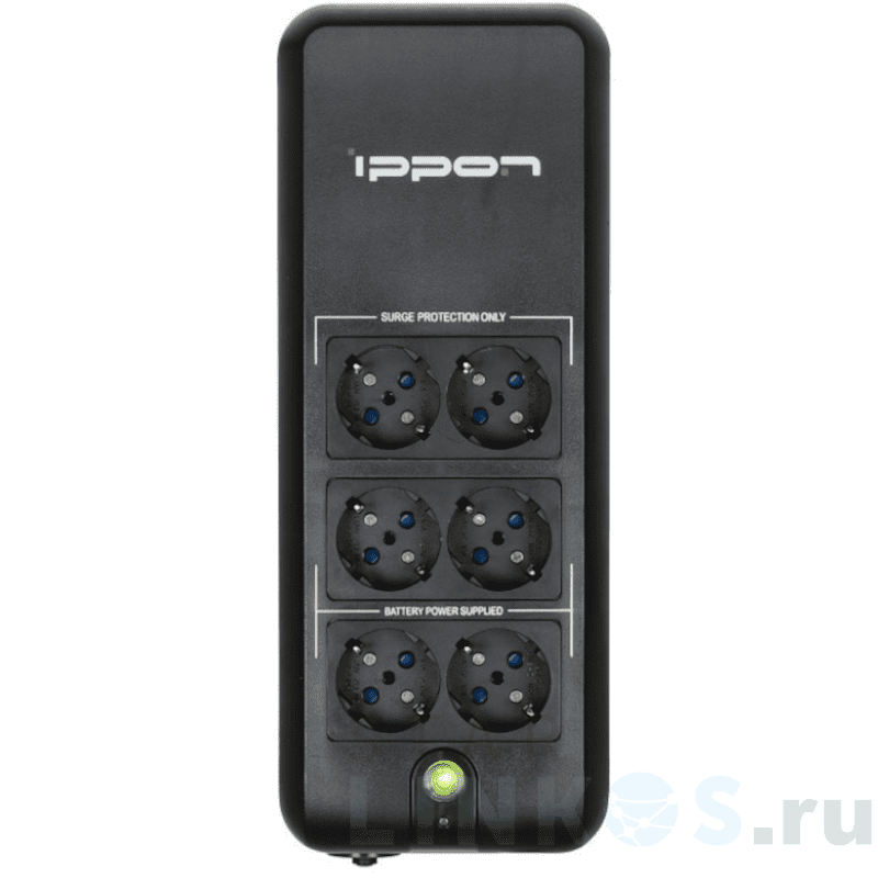 Резервный (Off-Line) ИБП Ippon Back Verso 400 рассчитан на одновременное подключение до шести устройств через четыре разъема Euro с батарейной поддержкой и две розетки только с функциями сетевого фильтра. Источник поддерживает постоянную фильтрацию входного напряжения и защищает подключенные устройства от радиочастотных и электромагнитных помех, высоковольтных выбросов, скачков напряжения и обесточивания. Допустимый интервал входного напряжения — 170–270 В. Форма выходного сигнала при сетевом режиме — синусоида, при батарейном —– модифицированная синусоида. Номинальная мощность ИБП — 400 ВА, активная — 200 Вт. При отсутствии напряжения в сети питание устройств обеспечивает свинцово-кислотная необслуживаемая батарея емкостью 4.5 А·ч. Среднее время переключения в автономный режим — 2… 8 мс, максимальное — 12 мс. Продолжительность автономной работы под нагрузкой 100 Вт — 9 мин. Длительность зарядки батареи с 0 % до 90 % емкости — до 10 ч. Back Verso 400 оснащен световой индикацией и звуковой сигнализацией статуса питания, перегрузки, низкого уровня заряда и полного его отсутствия, ошибки. Безопасность представлена защитой от короткого замыкания (выключатель без автоперезапуска), от перегрузки. Предусмотрена защита сети (RJ-45). Размер — 125×86×320 мм, вес — 3 кг.