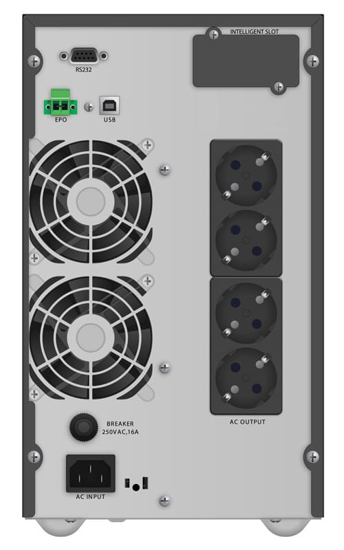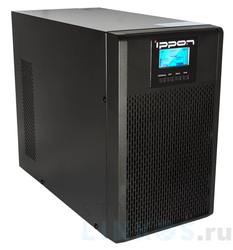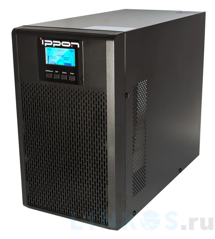 On-line ИБП Ippon Innova G2 Euro 2000 представляет собой однофазное устройство со схемой двойного преобразования тока. Выдает напряжение в форме чистой синусоиды. Рассчитан на четырех потребителей, подключаемых через разъемы IEC 320, с питанием от сети и батарей. Полная мощность ИБП — 2000 ВА, активная — 1800 Вт. Режимы работы UPS: Линейный (питание от сети). Питание от батарей. ECO — высокой эффективности (при стабильном напряжении на входе). EPO — аварийное отключение питания. Байпас. Тест аккумуляторов. Нагрузка отключена. Конвертера (CVCF) — установка частоты 50 или 60 Гц. Неисправность. Функциональность ИБП подает питание при широком диапазоне входного напряжения: 113 ~ 300 В при нагрузке 50 %, 176 ~ 300 В при нагрузке 100 %. Защищает от: Высоковольтных выбросов. Перегрузки при питании от сети: при нагрузке 105 ~ 130 % — переключение в режим байпаса через 60 с., 130 ~ 150 % — через 10 с., выше 150 % — через 300 мс. Перегрузки при питании от АКБ: при нагрузке 105 ~ 130 % — отключение через 10 с., 130 ~ 150 % — через 1 с., выше 150 % — через 300 мс. Перегрузки в режиме байпаса: при 130 ~ 180 % — отключение через 60 с., выше 180 % — через 300 мс. Короткого замыкания (автоматический выключатель). UPS поддерживает подключение к ПК через RS-232 или USB-порт для удаленного контроля управления питанием и мониторинга работы ОС компьютера (HID Smart Battery). Автономность Резервное питание обеспечивают четыре свинцово-кислотных герметичных батареи емкостью 9 А·ч. Аккумуляторы постоянно включены в электроцепь, поэтому переключение между режимами не занимает времени. Продолжительность автономной работы: 30 % нагрузка — 18.1 мин. 50 % нагрузка — 10.8 мин. 70 % нагрузка — 6.2 мин. 100 % нагрузка — 3.6 мин. Длительность восстановления заряда батарей от состояния полной разрядки до 90 % — 4 часа. Интерфейсы и управление Информацию о текущем состоянии работы ИБП (напряжение, нагрузка, режим, заряд АКБ etc) предоставляет LCD-дисплей и звуковая сигнализация. Для подключения сетевых карт предусмотрен универсальный слот. Интерфейсы: USB, RS-232, EPO. Охлаждение — вентиляторное. Шум от работающего устройства не превышает 44 дБ. Корпус выполнен в черном цвете. Интервал рабочих температур — 0 ºС… +40 ºС, защита корпуса от пыли и влаги соответствует стандарту IP20. Габариты — 190×327×399 мм, масса — 17.4 кг. Комплект поставки: ИБП Innova G2 Euro 2000. Компакт-диск с ПО. Соединительный кабель RS-232. Соединительный кабель USB. Силовой кабель. Руководство пользователя.