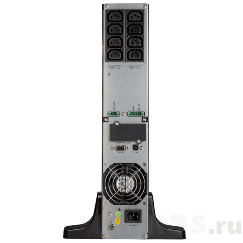 On-line ИБП на 8 устройств, разъемы выхода — 8×IEC 320 C13, разъем входа IEC 320, мощность полная — 1500 ВА, активная — 1350 Вт, питание в интервале 120–276 В, 45–66 Гц, четыре батареи 12 В, 7 А·ч — необслуживаемые герметичные свинцово-кислотные, RS-232, USB, EPO, сухие контакты, LCD-дисплей, вентилятор, 0 … +40 °C.