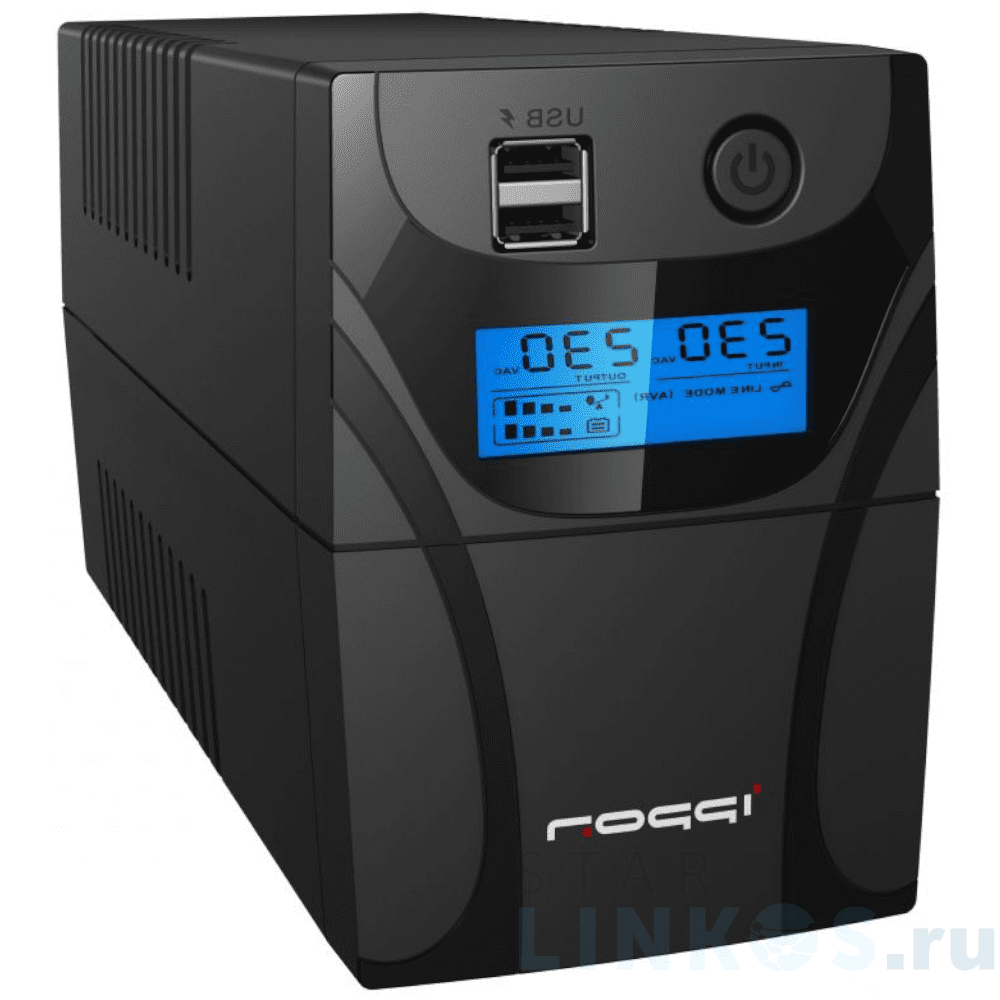 Линейно-интерактивный ИБП на 4 устройства, ввод сетевого кабеля питания, разъемы выхода Euro (4 шт.), аппроксимированная синусоида, полная мощность 2200 ВА, активная — 1200 Вт, питание вход 162–290 В, 45–65 Гц, AVR, две батареи 12 В, 9 А·ч — необслуживаемые герметичные кислотно-свинцовые, поддержка APFC нагрузки, защита и фильтрация, 2×USB зарядка, USB HID Smart Battery, 2×RJ-45, LCD-дисплей, звуковые сигналы, 0 ºС… +40 ºС.