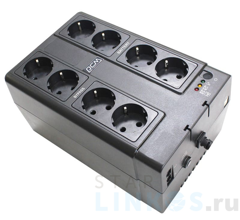 Резервный (Offline) ИБП Powercom Spider SPD-850E CUBE рассчитан на восемь потребителей, подключаемых через разъемы CEE7/7: четыре батарейной поддержкой и сетевой фильтрацией и четыре только с сетевой фильтрацией. Поддерживает питание устройств от сети без перехода на батареи в диапазоне входных напряжений 165 В ~ 290 В. Номинальная мощность — 850 ВА. Активная мощность — до 510 В. Функциональность Защита от перегрузки и короткого замыкания. Защита от импульсов для сетевого 10BaseT (RJ-45) или 2-проводной линии телефонного (RJ-11) кабеля. Green Mode — отключение ИБП при низкой нагрузке для энергосбережения. Холодный старт — пуск ИБП без входного напряжения, только на питании от батарей. Горячая замена батарей. Автономность Для автономного режима предусмотрена необслуживаемая герметичная свинцово-кислотная батарея 12 В емкостью 9 А·ч. Время переключения на питание от аккумулятора (типовое) — 2 ~ 4 мс. Продолжительность перезарядки АКБ до 90 % — 8 ч. Основные параметры SPD-850E CUBE оборудован светодиодами и звуковой сигнализацией для индикации и активации тревожных сигналов при переключении в режим батарейной поддержки, перегрузке, низком заряде АКБ. Диапазон рабочих температур — 0 ºС… +40 ºC. Уровень шума — менее 40 дБ. Габариты — 245×160×125 мм, масса нетто — 3.9 кг. Стандартная комплектация: ИБП Powercom Spider SPD-850E CUBE. Входной шнур питания 1.2 метра (встроен в корпус). Инструкция по эксплуатации. Гарантийный талон.