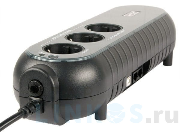 Резервный (Offline) ИБП Powercom WOW-300 подает напряжение в форме аппроксимированной синусоиды на три устройства, подключенных через две Euro-розетки с резервным питанием и одну с фильтрацией. Номинальная мощность — 300 ВА. Мощность нагрузки — не более 165 Вт. Функциональность Защита от КЗ — мгновенное отключение ИБП. Защита от всплесков напряжения — рассеивание 460 Дж за 8/20 мкс. Защита от перегрузки (автономный режим): при нагрузке ˃105 % — автоматическое выключение ИБП после истечения 20 с., при 120 % — 10 с, при 130 % — 3 с. Защита от глубокой разрядки батареи. Холодный старт. Функция Green Mode для экономии ресурса аккумулятора — UPS выключится через 4 мин. при отсутствующей или низкой (25 Вт) нагрузке; функцию можно отключить. Горячая замена батарей. Автоматическое самотестирование. Автоматическая подзарядка аккумулятора. Автономность Источник резервного питания — герметичная свинцово-кислотная батарея 6 В емкостью 4.5 А·ч. Время переключения в режим — 2 ~ 4 мс. Продолжительность батарейной поддержки ПК с 15" монитором (нагрузка 100 Вт) — 4 мин. При полной разрядке батареи продолжительность восстановления заряда до 90 % — 8 ч. Основные параметры WOW-300 укомплектован светодиодными индикаторами и акустической сигнализацией для мониторинга за работой ИБП. Тип установки — напольный, возможно крепить на стену. Рабочие температуры — 0 ºС… +40 ºC. Уровень шума — Стандартная комплектация: ИБП Powercom WOW-300. Входной шнур питания 1.2 метра (встроен в корпус). Инструкция по эксплуатации. Гарантийный талон.