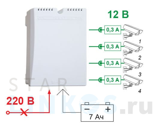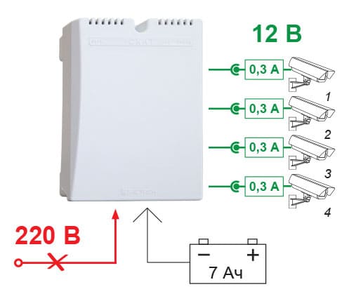На 4 устройства по 0.35 А Напряжение сети 100 В ~ 250 В Напряжение на выходе 12 В DC Защита и фильтрация помех IP20, –10 °C… +40 °C