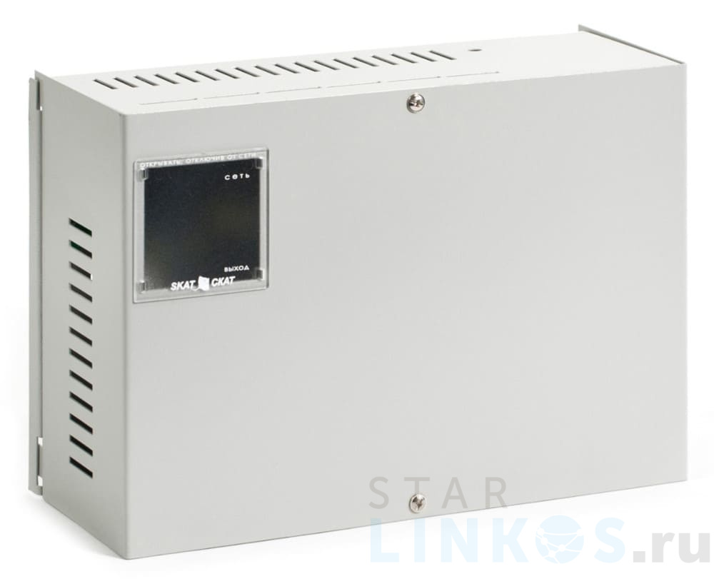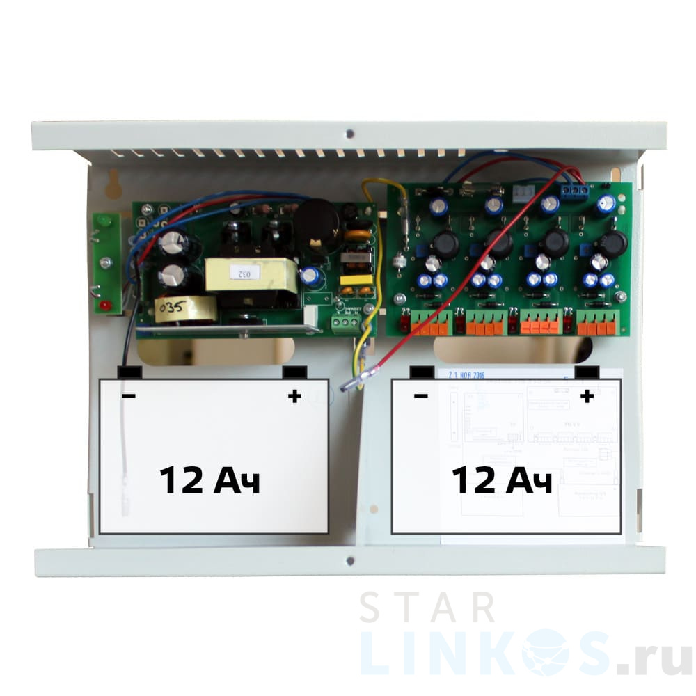 Восьмиканальный резервированный источник вторичного питания «Бастион» Skat-V.8 оборудован восемью выходами. Ток нагрузки — не более 0.5 А для восьми каналов или не более 1 А для четырех каналов. Функциональность: Основной режим — от сети при напряжении в диапазоне 187 В ~ 242 В. Резервный режим — от АКБ при отсутствии сетевого питания и выходе напряжения за пределы заданного диапазона. Плавная независимая регулировка для компенсации падения напряжения при передаче: минимальное — 11.8 В ~ 12.91 В, максимальное — 14.6 В ~ 15.2 В. Защита нагрузки от повышенного напряжения ограничением до 18 В при неисправности преобразователей. Электронная защита выходов от перегрузки по току отключением соответствующих выходов (остальные устройства получают питание). Защита батарей от глубокой разрядки отключением нагрузки при 21 В ~ 22.5 В на клеммах АКБ. Фильтрация помех взаимного влияния нагрузок по каждому каналу. Холодный пуск — запуск ИБП от батареи (не менее 23 В на клеммах АКБ). В корпусе Skat-V.8 предусмотрено место для двух герметичных свинцово-кислотных батарей с напряжением 12 В и емкостью 7 А·ч ~ 12 А·ч (в комплект не включены). Суммарное номинальное напряжение АКБ — 24 В, после зарядки — 27 В. Источник питания укомплектован платой преобразователя напряжения PN-V.8, входным предохранителем (6.3 А), аккумуляторным предохранителем (5 А), клеммами подключения сети, выходов и АКБ, индикаторами сетевого питания и напряжения на преобразователях выходов. Потребляемая мощность без нагрузки — до 20 ВА. Рабочие температуры — –10 ºС… +40 ºС. Размер — 315×220×123 мм, вес — 2.6 кг. В комплект входит плавкая вставка ВПТ6 6.3А 250 В и аккумуляторная перемычка.
