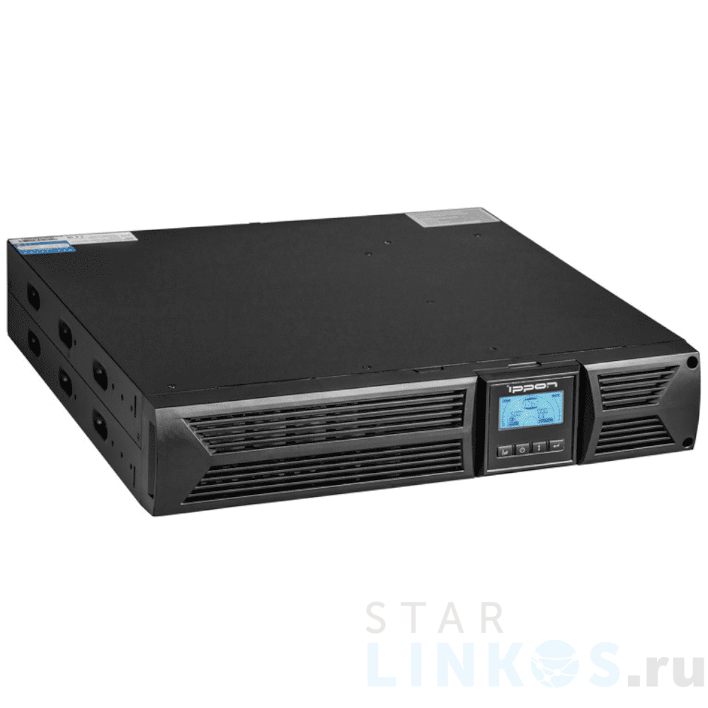 On-line ИБП Ippon Innova RT 2000 на 8 устройств, разъемы выхода — IEC 320 C13 для питания от сети/батареи, разъем входа IEC 320 C14, мощность полная — 2000 ВА, активная — 1800 Вт, питание в интервале 120–276 В при 50 % нагрузке, 176–276 В при 100 % нагрузке, 45–65 Гц, 4×батареи 12 В, 9 А·ч — необслуживаемые герметичные свинцово-кислотные, защита и фильтрация, RS-232 и USB type B, IP20, вентилятор, 0 … +40 °C.