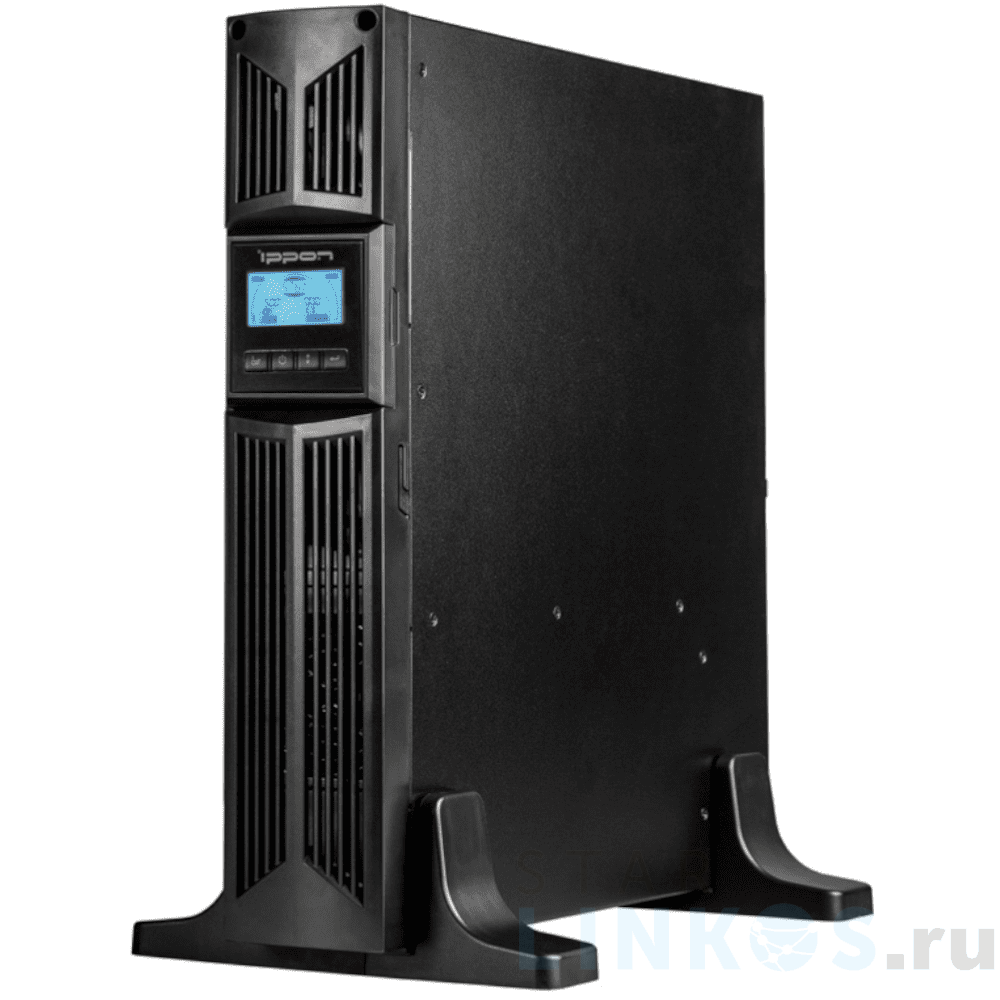 Однофазный UPS On-line Ippon Innova RT 3000 с двойной трансформацией входного напряжения (инвертор преобразовывает переменный ток в постоянный и обратно) отделяет подключенные устройства от электросети, обеспечивает напряжение в форме чистой синусоиды, защищает серверы и прочее дорогостоящее оборудование. Рассчитан на подключение до девяти устройств через разъемы 8×IEC 320 C13 и 1×IEC 320 C19 с питанием от сети и АКБ. Полная мощность ИБП — 3000 ВА, предельно допустимая нагрузка (активная мощность) — до 2700 Вт. Режимы работы UPS: линейный, питание от АКБ, Bypass (от сети напрямую, через фильтры ИБП, без батарейной поддержки), ECO (от сети напрямую, через фильтры ИБП, с батарейной поддержкой), конвертера (фиксированная частота на выходе — 50/60 Гц), ожидание (без нагрузки). Функции защиты ИБП и подключенных устройств Постоянно функционирующие фильтры входного напряжения защищают подключенное оборудование от перегрузок при питании в линейном режиме, автоматического байпаса, питании от АКБ, от высоковольтных сетевых выбросов (764 Дж). UPS питает устройства от электросети, если напряжение входа не выходит за границы 120–276 В при нагрузке 50 % и 176–276 В при нагрузке 100 %. При выходе за указанные границы или прекращении подачи тока от сети устройства переходят на резервное питание. Дополнительные функции: «Холодный старт» — подключение ИБП исключительно на заряде батарей, аварийное отключение — EPO. Мощность устройства можно нарастить, подключив дополнительные батарейные модули (в комплект не включены). Автономность Для резервного питания ИБП оснащен шестью свинцово-кислотными батареями емкостью 9 А·ч. Переключение между режимами проходит без задержки. Длительность автономной работы: 30 % нагрузка — 22.8 мин. 50 % нагрузка — 12.1 мин. 70 % нагрузка — 6.9 мин. 100 % нагрузка — 3.5 мин. После полной разрядки АКБ заряжаются до 90 % за 3 ч. Батареи при необходимости можно легко заменить. Интерфейсы и управление Интерфейсы связи — RS-232 и USB type B. Для контроля и управления предусмотрен сегментный поворотный LCD-дисплей с звуковыми сигналами, 2-цветной подсветкой и механическими кнопками для простого переключения режимов и демонстрации текущей информации о режиме, заряде батареи, напряжении входа и выхода, подключенных нагрузках, неисправностях. Для сбора данных предназначен универсальный слот для карт AS400 и SNMP. В комплект ИБП включен CD-диск с русифицированным ПО WinPower. В комплектацию Innova RT 3000 дополнительно входят кабели питания 2×IEC, телефонный, USB, Com (RS-232). Монтаж возможен в горизонтальном и вертикальном положениях, доступно встраивание в стойку 19" (форм-фактор 2U Rackmount), комплект для монтажа в поставку не включен. UPS оборудован звуковой и световой сигнализацией. Охлаждение — воздушно-принудительное, шум < 50 дБ, IP20, габариты 438×86.5×604 мм, вес нетто — 28.8 кг.