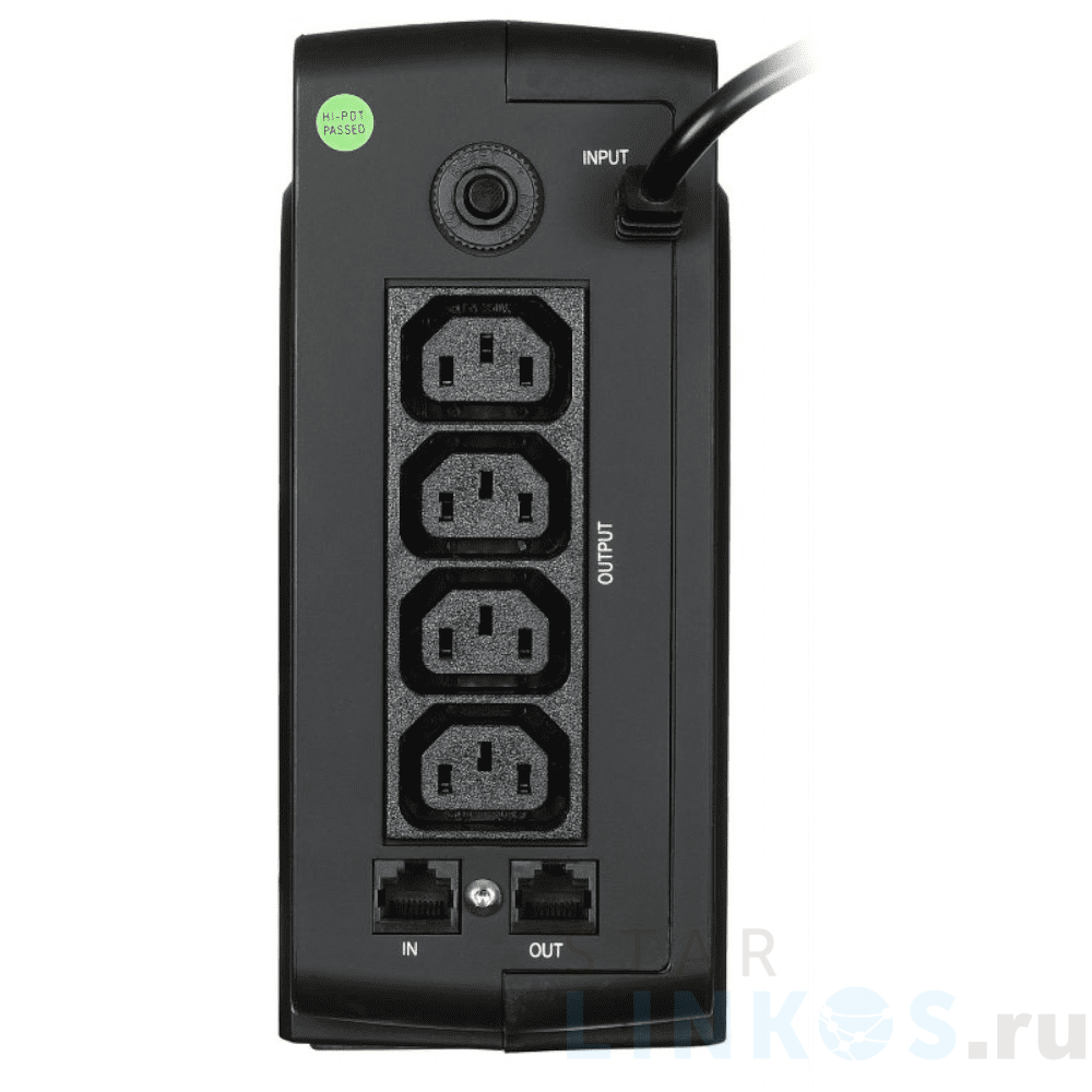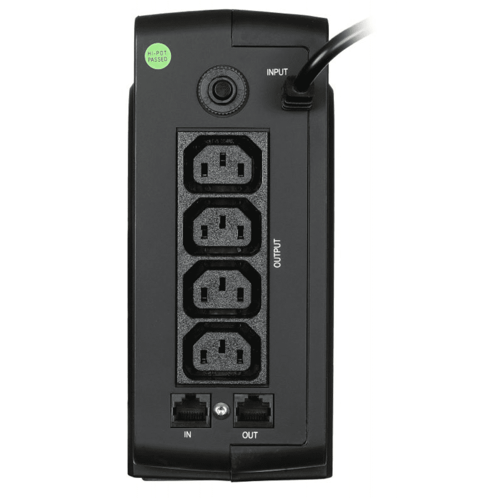 Резервный ИБП Back Office 1000 на 4 устройства, Off-Line, разъемы выхода IEC 320 C13 (4 шт.), разъем входа Schuko CEE 7/7P, полная мощность 1000 ВА, активная — 600 Вт, питание в интервале 170-280 В, 45-65 Гц, 2 батареи 12 В, 7 А·ч — необслуживаемые герметичные свинцово-кислотные, защита и фильтрация, RJ-45/RJ-11, светодиодная индикация, звуковые оповещения, IP20, 0… +40 °C.
