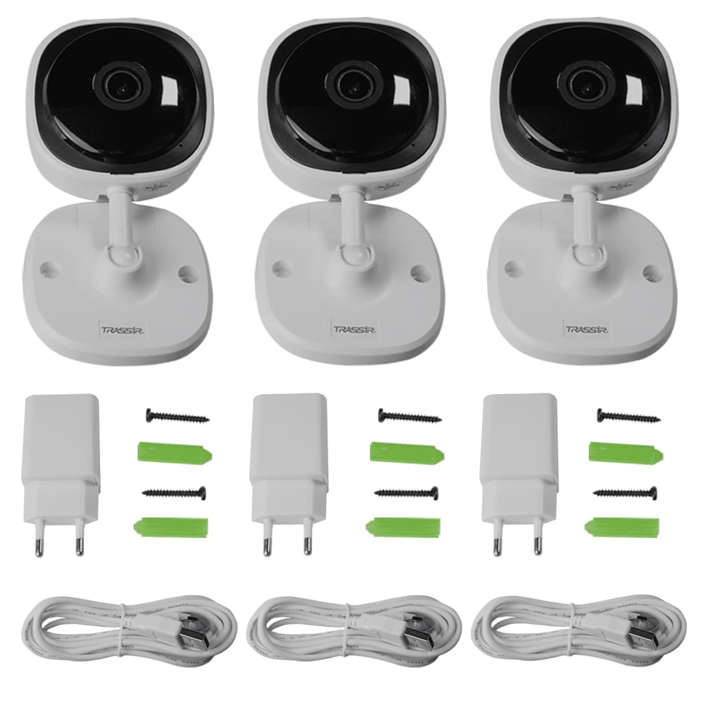 Комплект облачного видеонаблюдения TRASSIR Cloud «Домашний» включает в себя три беспроводные облачные IP-камеры TRASSIR TR-W2C1 (2.8 мм) и промокод на 2000 рублей для подключения к TRASSIR Cloud для записи архива в облако с настройкой тревожных уведомлений о движении, звуке и сигналах встроенного детектора саботажа, экспортом видео, расширенным функционалом управления камерой. 2000 рублей хватает на полгода использования облака. Промокод предназначен физическим лицам — юридические лица не смогут воспользоваться услугой. TRASSIR TR-W2C1 (2.8 мм) Внутренняя 2 Мп (1920×1080) IP-камера TRASSIR TR-W2C1 (2.8 мм) оборудована Wi-Fi-модулем для беспроводной передачи данных. Базируется на высокочувствительной (0.005 лк) 1/2.9-дюймовой CMOS-матрице, укомплектована объективом с фиксированным фокусным расстоянием 2.8 мм. TRASSIR TR-W2C1 (2.8 мм) работает исключительно с облаком: не совместима по ONVIF, не поддерживает TRASSIR OS, не подключается к проводной сети (LAN-разъем не предусмотрен) — только к беспроводной по Wi-Fi. Функциональность WDR 105 дБ — нейтрализация влияния разноконтрастного освещения на качество картинки. 3D DNR — пространственное шумоподавление. Компрессия потока кодеками H.264 или H.265. Микрофон и динамик для двусторонней аудиосвязи. ИК-подсветка дальностью действия 10 м. Активация записи видео по сигналу детектора движения. Режим день/ночь с механическим ИК-фильтром, преломляющим свет инфракрасного диапазона при достаточном освещении; в темноте фильтр сдвигается в сторону от матрицы для повышения ее чувствительности и работы подсветки. Предусмотрен слот для microSD емкостью до 128 Гбайт. По умолчанию после установки SD-карты камера активирует функцию записи архива по сигналу детектора движения. Записанный архив можно посмотреть через приложение TRASSIR-Client — при условии подключения камеры к TRASSIR Cloud. Для корректной работы SD-карты необходимо предварительное форматирование. Скорость трансляции — 25 fps. Битрейт — 8 Мбит/с. Питание — DC 5 В (1 А). Блок питания — в комплекте. Энергопотребление — 4.5 Вт макс. Размер — 110×66×66 мм, вес — 250 г. Видеообзор