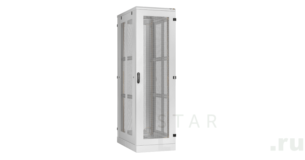 Серверный напольный шкаф TLK TFA-426010-PPPP-GY стандарта 19" (серия 482.6 мм по ГОСТ 28601.2-90) с 4-сторонним доступом к оборудованию состоит из основания, двух цельносварных рам с перфорированными дверями, крыши, двух боковых перфорированных стенок, четырех направляющих. Характеристики дверей: одностворчатые, перенавешиваемые, с углом открывания 180º, 4-точечными замками. Характеристики: Конструкции — сборно-разборная. Высота — 2060 мм (42 U). Ширина — 600 мм. Глубина — 1000 мм. Рабочая ширина — 484 мм. Полезная глубина — 900 мм. Вес — 131 кг. Максимальный вес установленного оборудования — 1100 кг. Перфорация дверей и стенок — 72 %. Шаг регулировки направляющих — 14 мм. Расстояние между направляющими — до 836 мм. Юнитовая маркировка направляющих. Защелки быстрой фиксации и замки боковых стенок. Система заземления. Отверстия в основании и крыше — для вентиляторных модулей. Проемы для кабельных вводов — в крыше и основании. TFA-426010-PPPP-GY соответствует климатическому исполнению УХЛ 4.2 по ГОСТ 15150-69: рабочие температуры — +1 ºС… +40 ºС, относительная влажность — не более 80 %; стандарту защиты от пыли и влаги IP20. Толщина листовой стали: Боковых стенок — 1.2 мм. Дверей и несущей конструкции — 1.5 мм. Направляющих — 2 мм. Поверхности шкафа покрыты порошковой полимерно-эпоксидной краской светло-серого цвета (RAL 7035). Направляющие гальванически оцинкованы. Крепления, провода заземления, ключи от замков — в комплекте.
