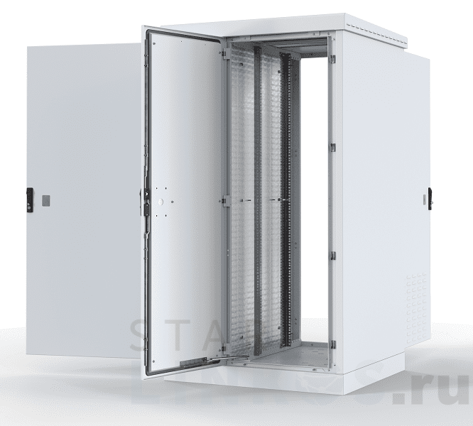 Напольный телекоммуникационный шкаф ЦМО ШТВ-2-12.10.6-43А3 выполнен в типоразмере 19", соответствует ГОСТ 28601-90 (МЭК 297), УХЛ1 по ГОСТ 15150. Предназначен для уличной эксплуатации под непосредственным воздействием осадков и солнечных лучей в интервале рабочих температур –50 °C… +45 °C с уровнем влажности не более 80 % при 20 °C. Корпус защищен от влаги и пыли по стандарту IP65, с вентиляционной системой — IP54. Уклон крыши и антикапельная система предохраняют уплотнитель дверей от воды. Предусмотрены две секции — телекоммуникационная и электротехническая, три двери универсальной навески, посадочные места для обогревателя, вентиляторного модуля или кондиционера, две DIN-рейки для монтажа электротехнического оборудования, 100-миллиметровый цоколь. Опционально можно заменить заднюю дверь стенкой, цоколь — на 300-миллиметровый, выделить отдельную секцию под аккумуляторы, разделив полкой телекоммуникационную, установить антивандальные замки, подключить внешний источник питания, например генератор, через внешнюю розетку. Задняя стенка, полка, 30-сантиметровый цоколь, антивандальные замки и розетка не входят в комплект. Характеристики, комплектация Основные параметры: Высота — 12 U. Ширина — 1045 мм. Глубина — 630 мм. Полезная глубина — 520 мм. Сварная конструкция. Система заземления. Дверные замки с удобной ручкой. Вентиляционные проемы в крыше. Пенорезиновый уплотнитель по контуру каждой двери. Две пары монтажных профилей с юнитовой маркировкой. Окно с дверцей для установки внешней розетки — на передней стенке. Несущая способность при распределенной статической нагрузке — 800 кг. Предусмотрены кабельные вводы 32.5 мм и 20.5 мм — в основании и разделительной панели. Шкаф изготовлен из оцинкованной стали. Толщина металла разделительной панели — 2.5 мм, двери — 2 мм, остальных деталей — до 2 мм. Поверхности окрашены порошковой краской светло-серого (RAL 7035) цвета, утеплены термоизоляционным фольгированным материалом. В комплекте термоизолятор на клеевой основе — для основания. Размер — 1045×630×775 мм, вес — 108 кг. Шкаф устанавливают на ровную горизонтальную поверхность, крепят (цоколь) анкерными болтами.