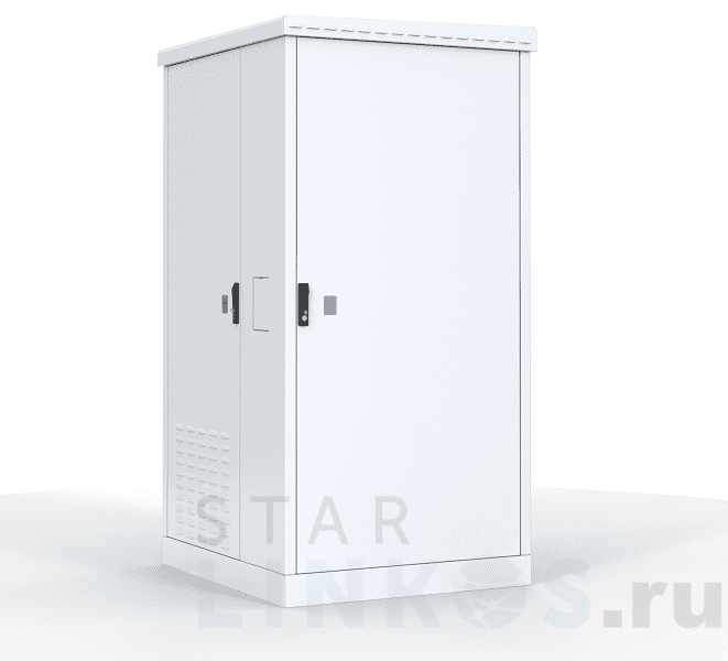 3-дверный 19" телекоммуникационный шкаф ЦМО ШТВ-2-18.10.9-43А3 высотой 18 U, шириной 1045 мм, глубиной 930 мм, полезной глубиной 820 мм разработан с учетом уличных условий эксплуатации под непосредственным воздействием осадков в диапазоне температур –50 °C… +45 °C с влажностью максимум 80 % при 20 °C. Состоит из двух секций — телекоммуникационной и электротехнической. Соответствует ГОСТ 28601-90 (МЭК 297), УХЛ1 по ГОСТ 15150, IP65 (с установленными вентиляторными модулями или кондиционером, фильтрами — IP54). Во фронтальной двери расположены посадочные места под обогреватель, вентиляторный модуль или кондиционер. Предусмотрены 2 DIN-рейки для установки электрооборудования. Телекоммуникационную секцию можно разделить полкой (в комплект не входит) на две, заднюю дверь — заменить полкой (в комплектацию не включена) Характеристики, комплектация Основные параметры: Сварная конструкция. Контур заземления. Дверные замки с удобной ручкой, возможность установки антивандального замка. Съемный цоколь высотой 100 мм (можно заменить на 300-миллиметровый). Универсальная навеска дверей. Вентиляционные окна в крыше. Пенорезиновый уплотнитель по контуру каждой двери. Две пары оцинкованных вертикальных направляющих с юнитовой маркировкой. Закрывающееся окно для установки внешней розетки — на передней стенке. Несущая способность при распределенной статической нагрузке — 800 кг. Крыша выполнена с уклоном и антикапельной системой, чтобы вода стекала, не попадая на уплотнитель двери, в разделяющей отсеки панели — заглушенные отверстия 32.5 мм и 20.5 мм для ввода кабелей. Шкаф изготовлен из оцинкованной стали. Толщина металла разделительной панели — 2.5 мм, остальных деталей — до 2 мм. Листовые детали покрыты порошковой краской светло-серого (RAL 7035) цвета. Размер — 1045×930×1040 мм, вес — 167 кг.