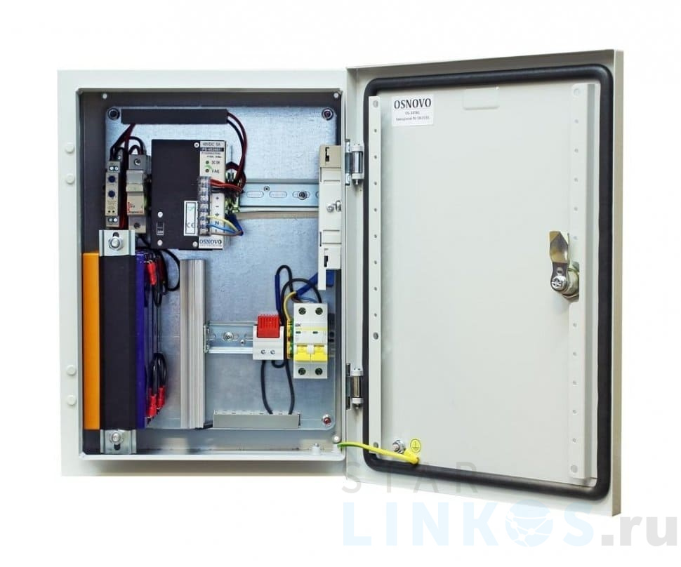 Станция Osnovo OS-34TB1 адаптирована к круглогодичной эксплуатации на улице: корпус соответствует стандарту защиты от пыли и влаги, рабочие температуры — –40 ºС... +50 ºС (без учета ветра), предусмотрен комплект гермовводов. Состоит из герметичного металлического бокса и комплекта оборудования: Оптического кросса: разъемное соединение для коммутации волоконно-оптического кабеля. Нагревателя (без вентилятора) для установки на DIN-рейку и нормально замкнутого термостата (отключение нагревателя при +15 ºС и выше). Блока питания PS-48240/I (DC 48 В, 240 Вт) для питания встраиваемого оборудования. Системы резервного питания термошкафа. Автоматического выключателя (2Р, 10 A). Характеристики оптического кросса: Модуль на два SC-порта. Два оптических одномодовых пигтейла (SC 0.9 мм, 1.5 м). Ложемент на восемь КДЗС (два в комплекте). Размер — 183×113×22 мм. Состав системы резервного питания: Реле контроля напряжения АКБ, 40 ~ 80 В, ток не более 10 A — защита от глубокого разряда. Четыре свинцово-кислотных аккумулятора 12 В емкостью 2.2 A·ч (общее напряжение — 48 В). Две плавкие вставки (для АКБ) 10 A, 400 В — защита от перегрузок и КЗ. Держатель для пластиковой вставки (для АКБ) на DIN-рейку, 20 А. Система обогрева поддерживает внутри станции температуру в пределах от –7 ºС до +50 ºС. Питание — AC 100 ~ 240 В. Максимальная потребляемая мощность (с учетом обогрева и встроенного БП) — 340 Вт. Свободное место на верхней din-рейке под установку оборудования — 80 мм. Размер — 300×400×210 мм. Комплектация: Уличная станция Osnovo OS-34TB1. Набор гермовводов. Пигтейлы оптические, SM, SC/UPC — 2 шт. Комплект для защиты сварного стыка (КДЗС) — 2 шт. Ключ от монтажного шкафа. Руководство по эксплуатации. Упаковка.