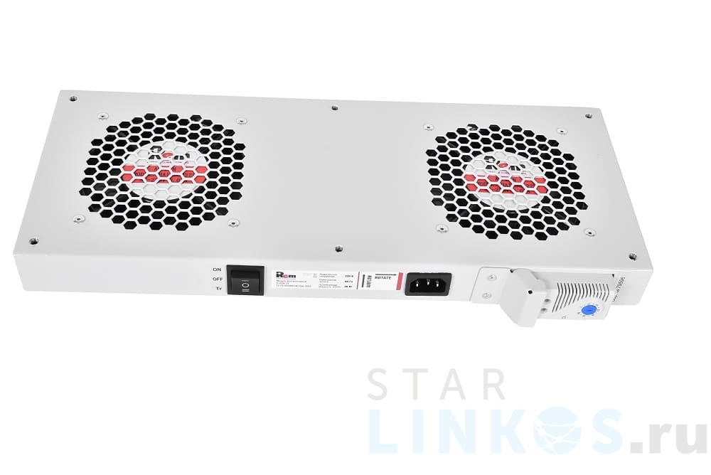 Вентиляторный модуль Rem R-FAN-2T для телекоммуникационных шкафов ШРН, ШРН-Э, ШРН-М, ШТК-М, ШТК-ПМ, ШТК-Э, ШТК-С, ШТВ и EMS ссостоит из двух осевых односкоростных вентиляторов и терморегулятора. Характеристики: Производительность — 2×150 м³/ч. Задание температуры в терморегуляторе — 0 ºС… +60 ºС. Запуск вентиляторов — при заданной температуре ±4 ºС. Выключение вентиляторов — при температуре, ниже установленной на 7 ºС ±4 ºС. Длина — 432 мм. Ширина — 170 мм. Высота (глубина) — 45 мм. Вес — 2.5 кг. Напряжение питания — 230 В. Энергопотребление — 32 Вт. Уровень шума — 2×43 дБ. Климатическое исполнение — УХЛ 4.2. Модуль устанавливают в крышу или в основание шкафа (крепеж в комплекте). В сложных условиях (улица, запыленные помещения) требуется фильтры R-FAN-FIP55 или R-FAN-F-IP21. Подключение — через порт IEC320 C14. Поверхность корпуса обработана (фосфатирование) и покрыта порошковой краской светло-серого цвета.
