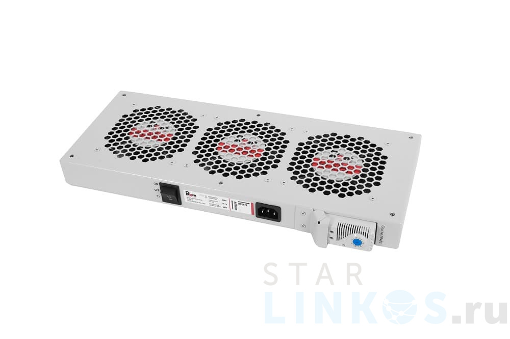 Вентиляторный модуль Rem R-FAN-3T включает в себя три осевых односкоростных вентилятора и терморегулятор, запускающий и отключающий вентиляцию. Рассчитан на интеграцию (крепеж в комплекте) в крышу или основание телекоммуникационных шкафов ШРН, ШТК-М, ШТК-ПМ, ШРН-Э, ШРН-М, ШТК-Э, ШТК-С, ШТВ и EMS. Характеристики: Производительность — 3×150 м³/ч. Пуск вентиляторов — при заданной температуре ±4 ºС. Отключение вентиляторов — при температуре, ниже заданной на 7 ºС ±4 ºС. Диапазон температур — 0 ºС… +60 ºС. Напряжение питания — 230 В. Энергопотребление — 48 Вт. Уровень шума — 3×43 дБ. Длина — 432 мм. Ширина — 170 мм. Высота (глубина) — 45 мм. Вес — 2.95 кг. Климатическое исполнение — УХЛ 4.2. Предусмотрено подключение через порт IEC320 C14. Шнур питания в комплект не входит. Корпус решен в сером цвете (порошковая краска), поверхность предварительно фосфатирована.