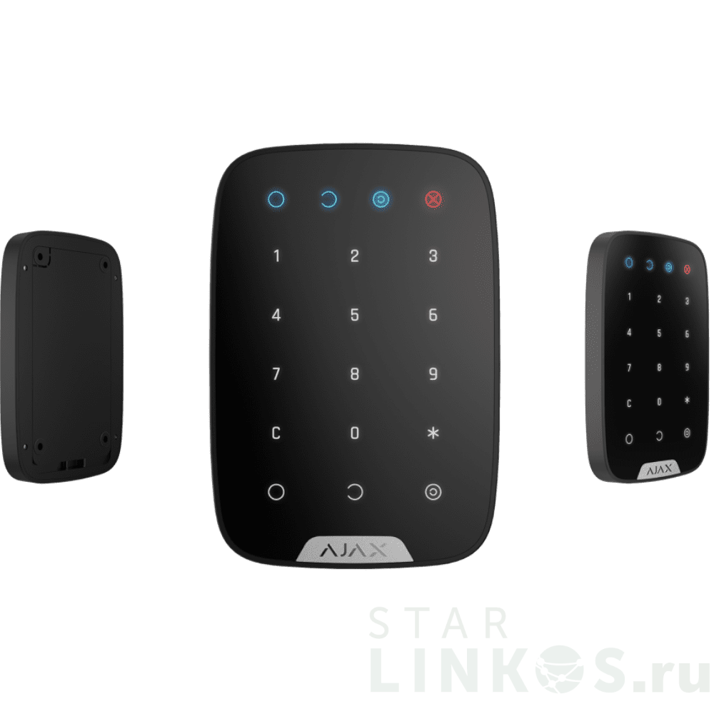 Беспроводная сенсорная клавиатура Ajax KeyPad предназначена для снятия и постановки объекта на охрану, контроля датчиков и статуса связи с охранной системой. Технические характеристики: Подсветка при одном касании. Совместимость с Hub, Hub Plus и ReX. Максимальная мощность радиосигнала — 20 мВт. Модуляция — GFSK. Работает от комплекта батарей ААА (4 шт., предустановлены). Функциональность: Подключение к Ajax Hub — скан QR-кода в приложении для смартфона. Настройка в мобильном приложении для смартфонов (ОС Android и iOS). Поставка и снятие объекта с охраны цифровым кодом или одной кнопкой. Включение тревоги одним нажатием. «Тихая тревога» — введение под принуждением специального кода; при этом сирена не срабатывает, система ложно подтверждает снятие объекта с охраны, а охранная компания получает сигнал тревоги. Защита от подбора кода — блокировка клавиатуры при трех неверных попытках в течение 0.5 ч. Разблокировка — автоматически и вручную. Тампер. Сообщения о глушении, о состоянии системы. Режимы: активный, энергосбережения, ночной. Символьные индикаторы сигнализируют о текущем статусе охранной системы и неисправностях (неполадки датчиков, обрыв связи с Hub). Диапазон рабочих температур — -10 °С… +40 °С. Габариты — 150×103×14 мм. Вес — 197 г. Комплектация: Сенсорная клавиатура KeyPad. Крепежная панель SmartBracket. Элементы питания: батареи ААА (предустановлены) — 4 шт. Монтажный комплект.