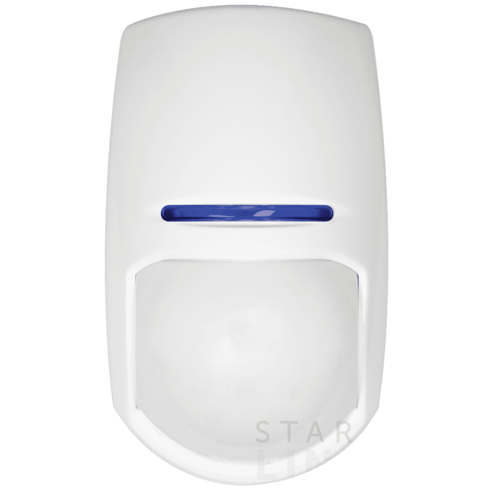 Беспроводной датчик движения, до 25 м, 90°, 0.3 ~ 3 м/с, нечувствительность к животным до 24 кг, тампер, цифровая компенсация температуры, двусторонняя связь до 800 м, 868 МГц, 3 батареи CR123A, 3 В, -10 °С… +40 °С.