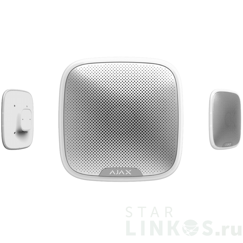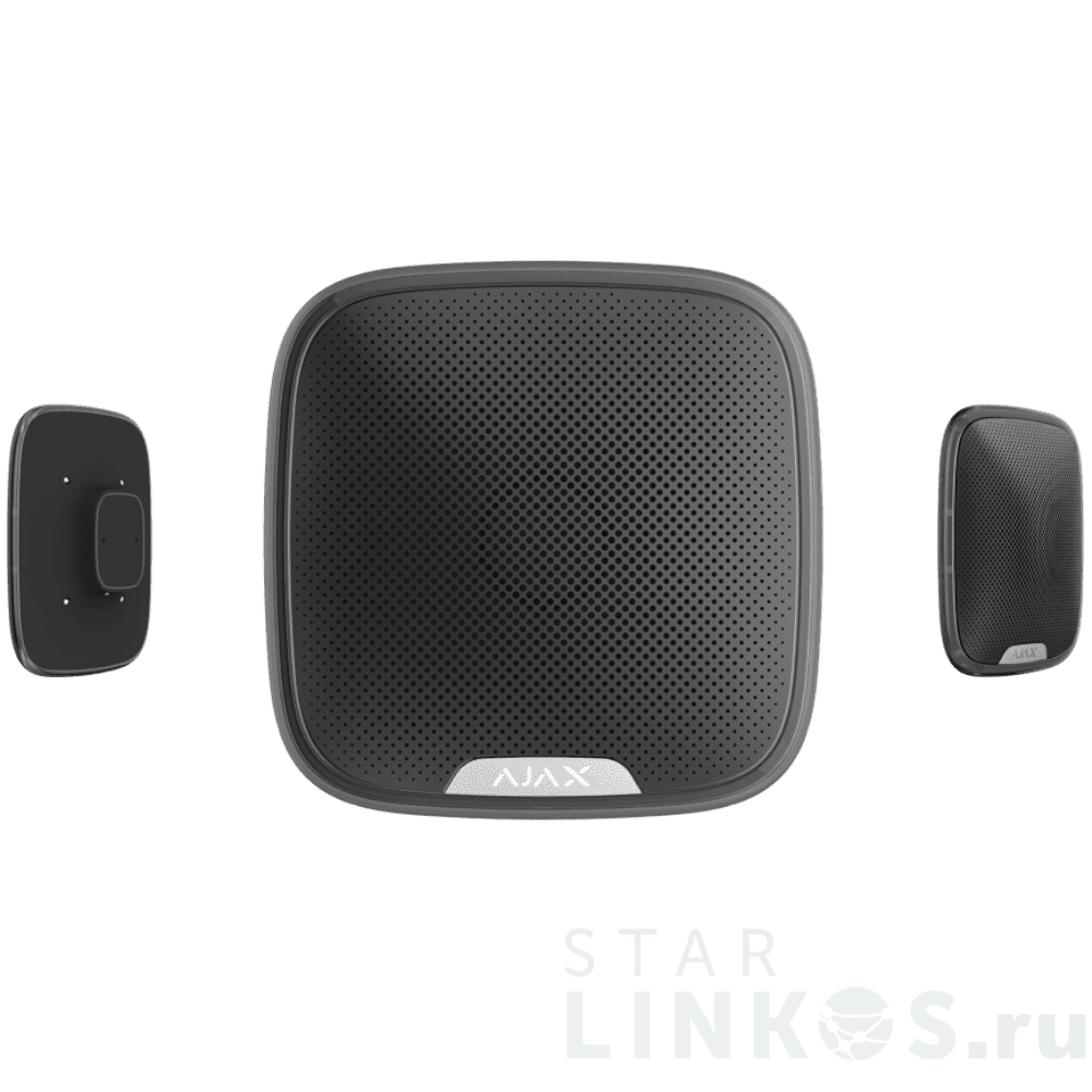 Беспроводная уличная светозвуковая сирена Ajax StreetSiren предназначена для звукового и визуального оповещения о тревоге при получении сигнала от смарт-централи Ajax Hub. Подключение к охранной сигнализации — по протоколу Jeweller. Расстояние до хаба — до 1.5 км свободного пространства. Технические характеристики: Совместимость с Hub, Hub Plus и ReX. Три уровня громкости звука в диапазоне 85 ~ 113 дБ. Время звучания тревоги — 3 ~ 180 с. Максимальная мощность радиосигнала — 25 мВт. Время доставки сигнала тревоги — 0.15 с. Модуляция — GFSK. Работает от четырех батарей CR123A (предустановлены). Предусмотрено питание от источника постоянного тока 12 В (в комплект поставки БП не входит). Функциональность: Подключение к системе — сканирование QR-кода в приложении смартфона. Настройка в приложении смартфонов с ОС Android и iOS. Индикация режима охраны (постановка/снятие). Настройка уровня громкости и длительности звучания сирены. Уведомления пользователя о тревожных событиях — push-нотификации, SMS-сообщения, звонки. Аутентификация для предупреждения подлога. Активация тревоги при попытке смещения/демонтажа сирены — встроенный акселерометр. Тампер. Сообщение о глушении. Корпус устройства защищен от влаги и пыли согласно стандарту IP54. Диапазон рабочих температур — -25 °С… +50 °С. При срабатывании тревоги кнопка вкл./выкл. блокируется для препятствования саботажу. Зуммер защищает металлическая сетка. Габариты — 200×200×51 мм. Вес — 528 г. Комплектация: Уличная сирена StreetSiren. Крепежная панель SmartBracket. Коннектор для LED-индикатора. Элементы питания: батареи CR123A (предустановлены) — 4 шт. Монтажный комплект.