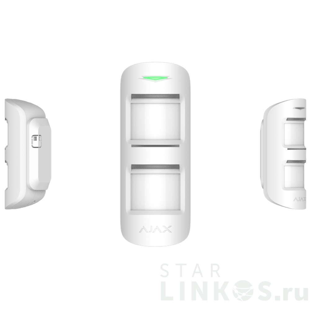 Уличный беспроводной датчик движения с защитой от маскирования, два PIR-сенсора, до 15 м, игнорирование животных, передача сигнала по зашифрованному радиоканалу (протокол Jeweller) на 1.7 км, тампер, QR-код, разъем для подключения датчиков сторонних производителей, две батареи CR123A, 3В, до 5 лет, внешнее питание 5-28 В DC, 200 мА, IP54, -25 °С… +60 °С.