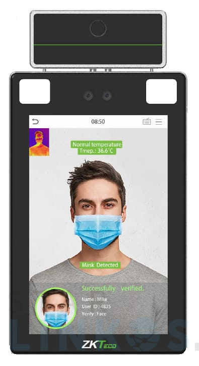 Биометрический терминал доступа Zkteco ProFaceX (TI) с распознаванием лиц и ладоней поддерживает доступ по карте, измерение температуры тела человека с точностью ±0.3°C, детектирует наличие маски на лице. Рассчитан на уличную работу в любое время года: корпус соответствует стандарту защиты от пыли и влаги IP68, от механических воздействий — коду IK04, рабочие температуры — -30 ºС… +60 ºС. Терминал построен на 2-ядерном процессоре с тактовой частотой 900 МГц и укомплектован тепловизионной 2 Мп камерой с сенсором Starlight, считывателем карт EM-Marin, ультразвуковым сенсором измерения расстояния для автоматической активации устройства. Объем RAM — 512 Мбайт, Flash — 8 Гбайт, вместимость — шаблоны 30 000 лиц и 5000 ладоней, 50 000 карт, 1 000 000 событий, 30 000 фото пользователей, 10 000 фото событий. Функциональность: Измерение температуры тела: диапазон — +34 ºС… +45 ºС, расстояние — 30 ~ 50 см, время — менее 0.1 с. Идентификация лиц — за 0.3 с., ладоней — за 0.35 с. DWDR — программная обработка картинки, полученной при освещенности до 50 000 лк, функция встроенной камеры. Поддержка расписания для групп, праздников, отпусков etc. Anti-passback — запрет двойного прохода. Поддержка доступа по паролю. Сохранение снимка события. Защита от подделок при идентификации. Журнал событий. Регулируемая яркость экрана. ProFaceX (TI) оборудован сенсорным экраном IPS 8" (400 лк), микрофоном с АРУЗ, динамиком, тампером. Поддерживает протокол TCP/IP. Из интерфейсов на борту: Wiegand вход/выход, RS-485, RS-232, релейный выход, выход тревожной сигнализации, вход Aux, кнопка выхода, вход геркона. Питание — DC 12 В. Потребляемый ток — менее 2 А. Размер — 279×143×27 мм. Вес — 853 г. Видеообзор