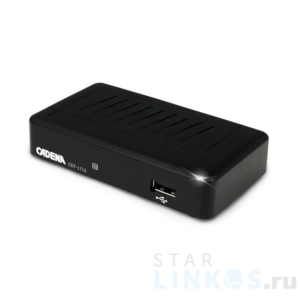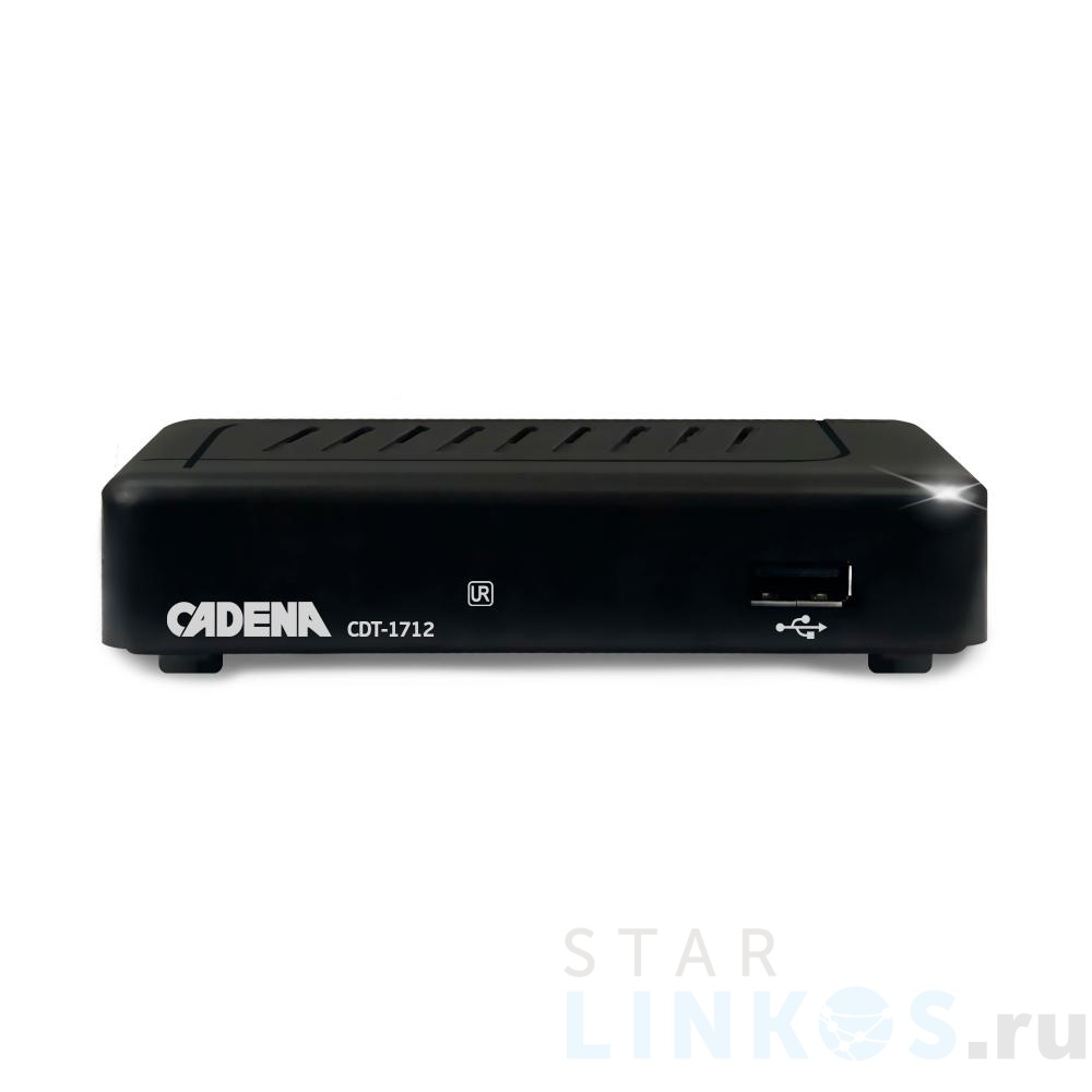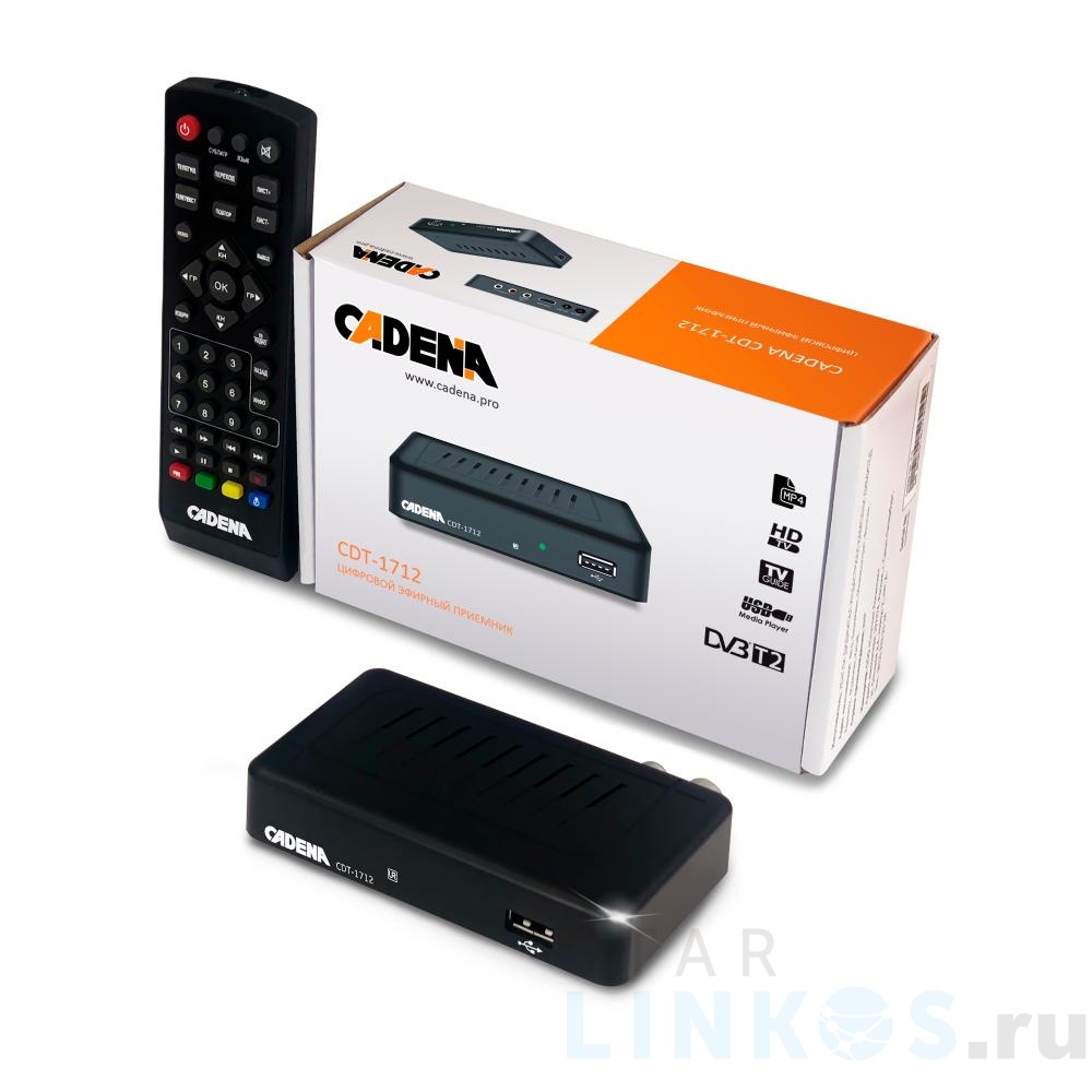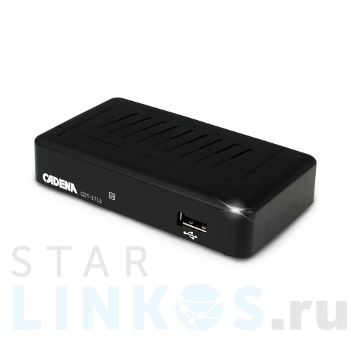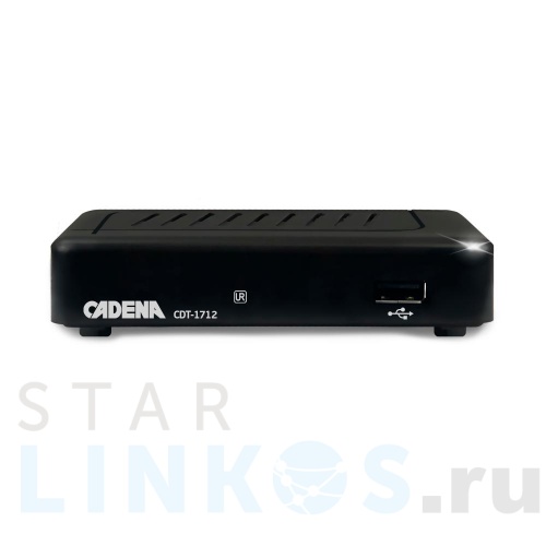 Комплектация Цифровой эфирный приемник CADENA CDT-1712, Пульт ДУ RC1712IR, Элемент питания : 1,5В AAA – 2шт., Блок питания A1712 DC5В/1,5А, Шнур 3RCA-3RCA - 1шт., Руководство пользователя, Гарантийный талон