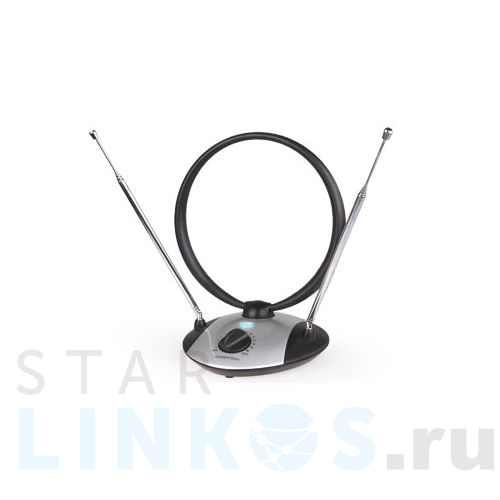 Активная всеволновая комнатная антенна с регулировкой усиления. Антенна имеет регулируемые телескопические диполи для лучшего приема диапазона МВ и кольцо ДМВ для приема качественного сигнала в этом диапазоне, а также индикацию питания и регулируемое усиление.
