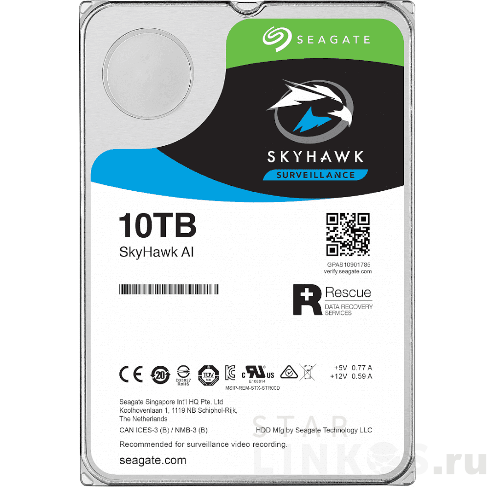 HDD для видеорегистратора: форм-фактор 3.5" , емкость 10 Тбайт, скорость передачи данных — 250 Мбайт/с, запись с 64 камер, 16 дисковых отсеков, емкость памяти — 256 Мбайт, круглосуточная работа (8760 ч/год), среднее энергопотребление — 6.9 Вт, 146.99×101.85×26.11 мм, +5 °C… +70 °C.